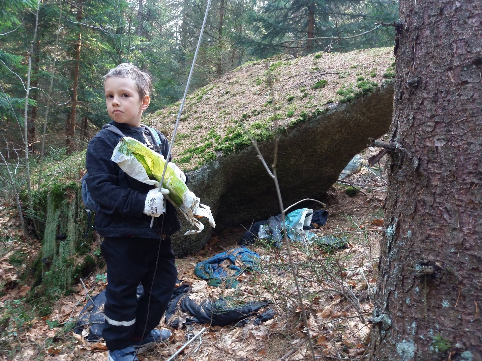 Úklid se nesl v duchu pohodového vycházkového tempa s hroznem dětí a sluncem nad hlavou. Od parkoviště naptroti sportovnímu areálu Břízky se kolem sádek Českého rybářského svazu pokračovalo po cyklostezce 3023 a kolem potoka až k turistickému přístřešku a nedaleké studánce GPS 50.7496328N, 15.1813236E{:target="_blank"}. Nedošlo na pneumatiky nebo staré lednice, přesto se na lesní cestě našlo několik pytlů odpadků včetně jenoho ležení dobrodruha bez domova, které již zarůstalo do jehličí, nebo starého šuplíku.