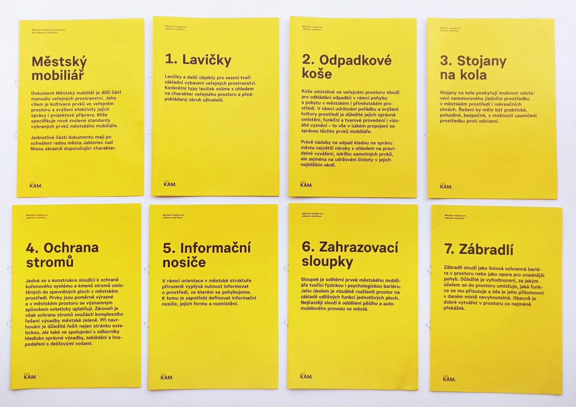 Dokument blíže specifikuje standardy jednotlivých prvků městského mobiliáře, slouží ke zjednodušení procesu výběru mobiliáře napříč úřadem s přesahem do projekčních prací v rámci investičních akcí města i soukromého sektoru. Část doporučených prvků, jako jsou lavičky, koše, nebo mříže rabátek pro stromy, jsou typové výrobky. Jednodušší prvky, jako jsou informační nosiče, zahrazovací sloupky, cyklostojany, nebo zábradlí, jsou naopak autorské návrhy připravené k realizaci v Technických službách nebo jinými místními dodavateli.